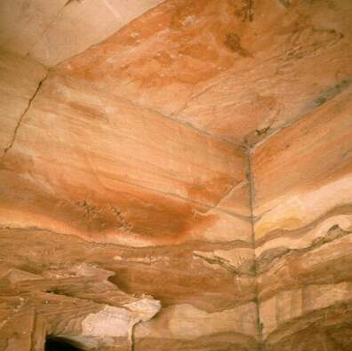 | Die Grabkammern im Inneren waren eher schmucklos. Die Wände sind glatt behauen, frei von schmückenden Reliefs, Statuen usw. Vielleicht waren die Wände früher verputzt und bemalt. Heute jedenfalls präsentieren sie sich in ihrer natürlichen Schönheit, in dem gelblich-rötlichen, gemaserten Farbton des Sandsteins. | ![]() |