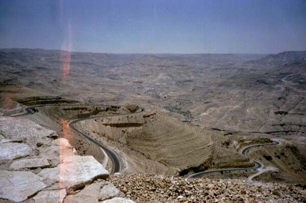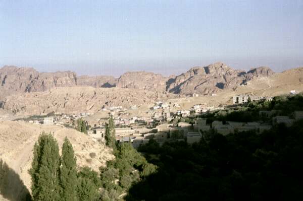 | Von Amman, der jordanischen Hauptstadt, fährt man nach Petra rund 200 km nach Süden. Die karge Landschaft zeigt sich als steinige Hochebene, durchzogen von felsigen Schluchten, den Wadis. Hier windet sich sich die Straße durch das Wadi Mujib. Das heutige Petra liegt vor dem Eingang zum antiken Petra am Wadi Musa in einer Oase. Hier soll Moses auf der Flucht aus Ägypten Wasser aus dem Felsen geschlagen haben. Im Hintergrund der Aronsberg, auf dem sich das Grab des biblischen A(a)ron befinden soll. | |