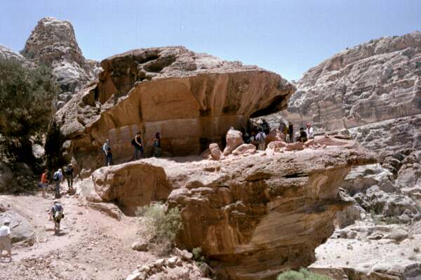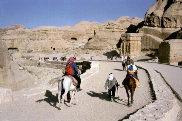 Vor dem eigentlichen Zugang zur Felsenstadt, auf dem Bab es-Siq, versuchen geschäftstüchtige Araber den Touristen ihre Pferde aufzuschwatzen, obwohl man heutzutage nur mehr zu Fuß dorthin gelangen kann. Rechts drei Monolithen, von den Beduinen Djinn-Blöcke (Geistergräber) genannt. |