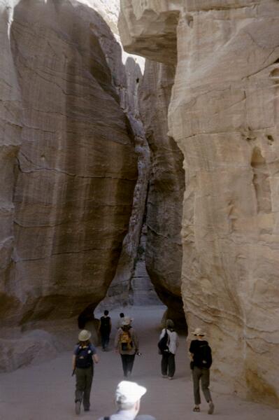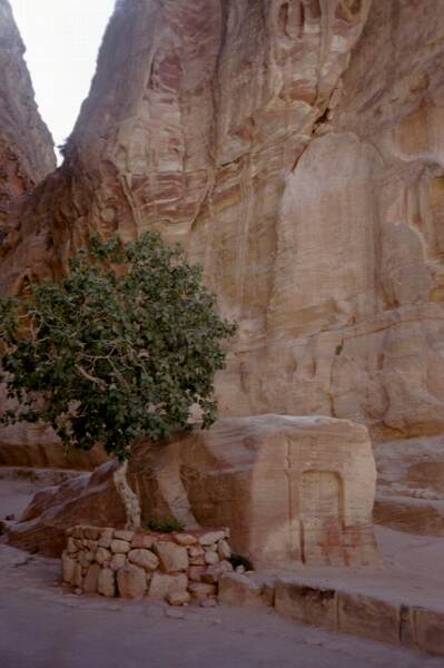 | Diese schmale Felsenschlucht, Siq genannt, bildet den über 1 km langen Zugang zur Felsenstadt. Bis zu 200m hoch türmen sich die Felsen zu beiden Seiten auf. Entstanden ist der Siq durch tektonische Verschiebungen. | An breiteren Stellen des Siq errichteten die Nabatäer Opferaltäre oder schmückten die Nischen mit gemeißelten Götterstatuen. Erkennbar ist hier bereits die rötliche Färbung des Sandsteins. |