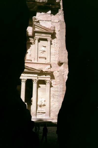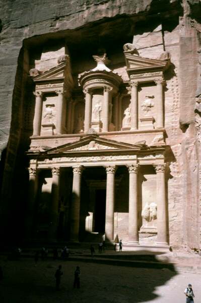 | Am Ende der Schlucht taucht plötzlich das erste (und prächtigste) Bauwerk von Petra, Khazne Faraun, im Sonnenlicht auf. Khazne Faraun, Schatzhaus des Pharao, nannten die Beduinen dieses monumentale Bauwerk in der irrigen Annahme, die alten Ägypter hätten hier ihre Schätze versteckt. In Wirklichkeit dürfte es sich um das Grab eines nabatäischen Königs handeln. 40 m hoch ist die Fassade und voll aus dem Fels herausgemeißelt; einen Fehler durften sich die damaligen Steinmetze nicht leisten, denn der Schaden wäre irreparabel gewesen! Indiana Jones-Fans dürfte das Gebäude aus der Schlußszene des Films "Der letzte Kreuzzug" bekannt vorkommen. | |