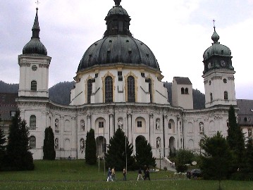 Ettal ist ein Benediktinerkloster, das im Jahre 1330 vom bayerischen Herzog und deutschen Kaiser Ludwig IV. gegründet wurde. Die erste Klosterkirche entstand zwischen 1330 und 1370 als zwölfeckiger Zentralbau. 1710 bis 1724 wurde unter dem Baumeister Henrico Zuccali (kurfürstlicher Hofbaumeister in München) mit der Barockisierung begonnen, aber wegen Geldmangel nicht weitergeführt. 1744 brannte die Kirche dann ab und wurde 1744 bis 1762 von Baumeister Joseph Schmuzer (1683 - 1752) aus der Wessobrunner Schule , der zuvor und zeitgleich auch die Klosterkirche Rottenbuch errichtete (siehe nächstes Kapitel), als Barockbau wiederaufgebaut; die Stuckdekorationen wurden von Johann Georg Übelher und Franz Xaver Schmuzer (dem Sohn des Baumeisters) ausgeführt, die Fresken schufen Johann Jakob Zeiller und Martin Knoller, beide aus Tirol. Auch diesmal stockte der Bau (1762), dann kam die Aufhebung des Klosters 1803 dazwischen und erst 1853 wurde der Nordturm, der Südturm und die Fassade gar erst 1907 fertiggestellt. Die Ettaler Kirche ist in ihrer Form ungewöhnlich und gehört in ihrer Ausgestaltung zu den bedeutendsten Kirchenbauten des süddeutschen Barocks.