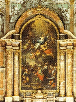![]() ![]() Die mächtige Kuppel ist 71 m hoch; die Türme wurden wie die Fassade erst später (1853 bzw. 1907) vollendet | Der Innenraum mit seiner prächtigen Barockausstattung ist zwölfeckig, wirkt aber durch die den Ecken vorgesetzten Pilaster rund | ![]() ![]() Das Altarblatt am Hochaltar stellt die Himmelfahrt Marias dar und stammt von M. Knoller | Die Ettaler Madonna aus weißem Marmor; sie wurde vom Klostergründer Ludwig IV. 1330 von seiner Italienreise mitgebracht | ![]() ![]() Das Deckengemälde des Hochaltarrraums von M. Knoller nimmt das Thema des Altarbildes auf und stellt den offenen Himmel, bereit zur Aufnahme Marias, dar | Das Deckengemälde der Hauptkuppel stellt die benediktinische Gemeinschaft in ihrer Geschichte dar (431 Gestalten!); geschaffen wurde es von J.J. Zeiller |