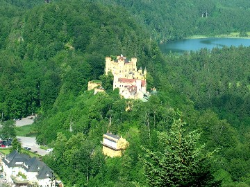 | Die Burg Hohenschwangau wurde im 12. Jh. von den Rittern von Schwangau erbaut. Nach dem Aussterben der Linie im 16. Jh. verfiel die Burg und wurde in den napoleonischen Kriegen stark beschädigt. Kronprinz Maximilian, der spätere König Max II. kaufte und restaurierte die Burg 1832 bis 1836. Die heute noch vorhandenen Wandgemälde stammen z.T. von Moritz von Schwind. König Ludwig II., der hier einen großen Teil seiner Kindheit verbrachte, dürfte durch die Darstellungen stark in seinem Faible für germanische Sagen und das Rittertum beeinflusst worden sein. | |||||||||||||||