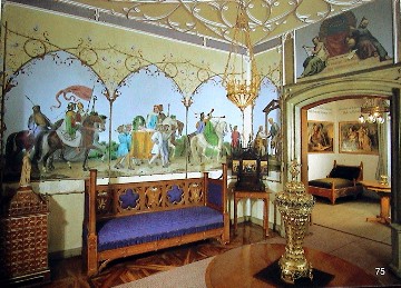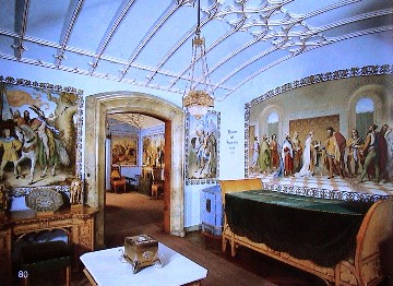 | Das Berchta-Zimmer (Schreibzimmer der Königin Marie); die Wandmalereien sind Karl dem Großen und seiner Mutter Berchta gewidmet | Im Authari-Zimmer ist die Brautwerbung des Langobardenkönigs Authari um die bayerische Prinzessin Theodolinde dargestellt | ||||||||||||||