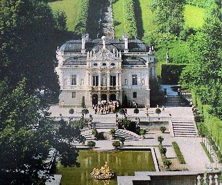 | Aus einem kleinen Holzhäuschen mit wenigen einfachen Zimmern, das König Max, der Vater von Ludwig II., in den 1850er Jahren erworben hatte, wurde unter Ludwig II. in mehreren Umbau- und Erweiterungsphasen zwischen 1869 und 1886 das rund 5x so große prächtige Rokokoschloss Linderhof. 1869/70 ließ König Ludwig II. (fast zeitgleich mit dem Baubeginn von Neuschwanstein!) als erstes das Königshäuschen innen modernisieren und anschließend 1870/71 um einen Nordostflügel erweitern, der aber bereits 1871/72 wieder abgebrochen und durch einen größeren Erweiterungsbau ersetzt wurde. 1874 wurde der Altbestand (das Königshäuschen) abgebrochen, an dessen Stelle bis 1876 ein doppelt so großer Eingangstrakt errichtet und allseitig die bisherige Holz- durch eine Steinfassade ersetzt. Die dann 1885/1886 nochmals erfolgte Vergrößerung des Schlafzimmers erlebte der König freilich nicht mehr. | |||||||||||||||