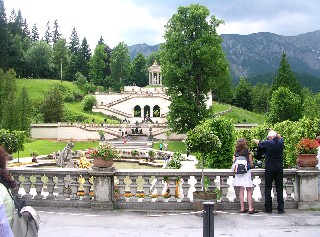 | Schloss Linderhof ist von einem rund 50 Hektar großen Park umgeben, in dem sich mehrere keinere Bauwerke und Pavillons befinden, darunter die berühmte Grotte: In einer künstlichen Tropfsteinhöhle (aus Eisen- und Drahtgestellen, Leinwand, Zement und Gips) glitzert ein vielfarbig illuminierter, durch eine Wellenmaschine bewegter See, in dem sich König Ludwig II. in einem eigens dafür gebauten Boot in Muschelform gerne herumrudern ließ. DasVorbild für diese Grotte war einerseits eine Beschreibung in einer Szenenanweisung in Richard Wagners "Thannhäuser", andererseits aber die bekannte blaue Grotte von Capri. Ferner befinden sich im Park der Maurische Kiosk mit dem Pfauenthron, die Hundinghütte (nach einer Beschreibung in Wagners Walküre), die Einsiedelei des Gurnemanz (aus Wagners Oper Parzifal), das Morokkanische Haus und der Hubertuspavillon.