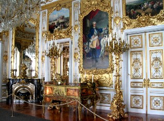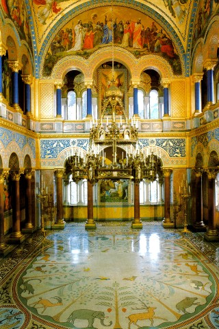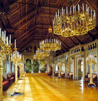 | Der Thronsaal (der Thron selbt wurde nach dem Tod des Königs nicht mehr hergestellt) gleicht in Form und Ausstattung einer byzantinischen Basilika, womit König Ludwig II. das Königtum von Gottes Gnaden , die religiöse Verbindung zwischen Gott und König versinnbildlichen wollt | |||||||||||||||