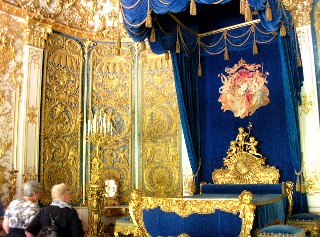 | Das reich ausgestattete Schlafzimmer (links); Detail der prächtigen, mit Gold überzogenen Holzschnitzereien (rechts) | |||||||||||||||