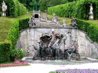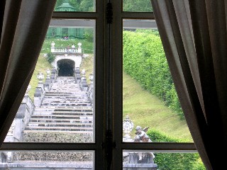 | Auf der Nordseite führt eine von Hecken gesäumte Wassertreppe über 30 Stufen hin zum Schloss, wo sie unter dem Schlafzimmerfenster in einen Neptunbrunnen mündet | |||||||||||||||