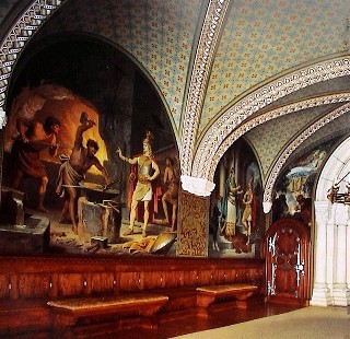 | Der Vorraum zur Königswohnung mit einem Kreuzrippengewölbe und Gemälden aus der Sigurd-Sage | Das königliche Arbeitszimmer ist in romanischem Stil gehalten; die Gemälde stellen Szenen aus der Thannhäuser-Sage dar | ||||||||||||||