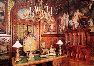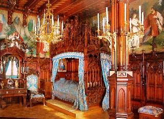 | Das Schlafzimmer im spätgotischen Stil mit einer Fülle von prunkvollen Eichenholzschnitzereien; die Wandgemälde zeigen Szenen aus der Sage "Tristan und Isolde" | Der Sängersaal, der im 4. OG die gesamte Fläche der Königswohnung im 3. OG überdeckt, ist nach dem Wunsche des Königs das eigentliche Zentrum des Schlosses; die Wandgemälde zeigen Ausschnitte aus der Parzifal-Sage | ||||||||||||||