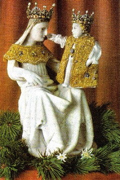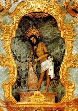 | Das Altarbild des Hochaltars (links) zeigt Jesus als Kind inmitten seiner Familie; darunter in einer Nische das Gnadenbild; die Holzfigur (rechts) ist der Ursprung der Wallfahrt und damit auch der Wieskirche | |||||||||||||||
