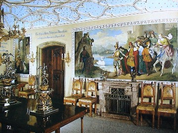 | Schloss Hohenschwangau, im Hintergrund der Alpsee | Der Schwanenrittersaal (früher Speisezimmer) mit den Darstellungen aus der Schwanenrittersage (Lohengrin) | ||||||||||||||