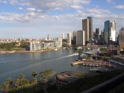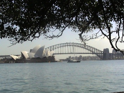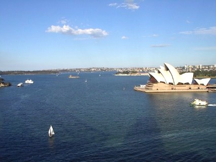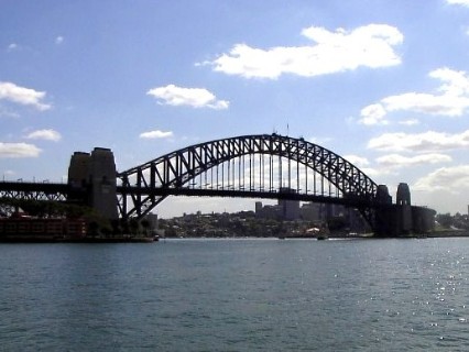 Ein weiteres Wahrzeichen Sydneys ist die Sydney Harbour Bridge. Sie wurde nach 8-jähriger Bauzeit 1932 fertiggestellt und verbindet die City mit den nördlichen Vororten. Die Spannweite der einbogigen Brückenkonstruktion beträgt 503 Meter. An den Streben des Bogens ist 59 Meter über dem Wasser die Fahrbahnebene aufgehängt.