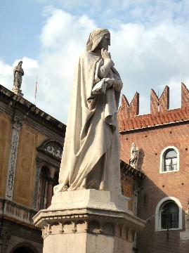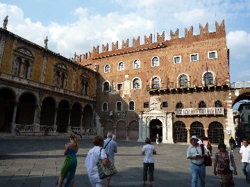 Piazza dei Signori mit der Loggia del Consilio und dem Palazzoo degli Scaligeri, unten der Zinnenturm und die Dante-Statue (von Zannoni) auf der Piazza dei Signori