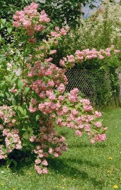 Beschreibung: Schön blühender Blütenstrauch mit auffallend großen Blütenrispen Form: Strauch Wuchshöhe: 3 - 6 m Blüte: Mai bis Juni bevorzugte Lage: Sonne oder Halbschatten Bodenanspruch: für die meisten Böden geeignet Pflege: nach der Blüte Blütenstände abschneiden Schnitt: wenn der Strauch zu dicht wird, bei Blattfall auslichten; zu hoch geschossene Sträucher auf 90 cm zurückschneiden Pflanzen: Oktober bis März |