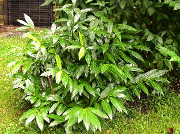 Beschreibung: Hübsche immergrüne Pflanze mit großen glänzenden Blättern; im Mai kleine weiße Blüten auf großen Blütenständen Form: Strauch Wuchshöhe: bis 2,5 m Blüte: Mai bevorzugte Lage: Sonne bis Halbschatten Bodenanspruch: Pflege: im Frühjahr reichlich gießen, Volldüngung; im April dick mulchen; im Juni Volldüngung Schnitt: kein Schnitt erforderlich; bei Verwendung als Hecke Formschnitt im Herbst; alte Pflanzen können durch Rückschnitt verjüngt werden Pflanzen: im Herbst oder bei milder Witterung bis zum März Anmerkung: Blätter, Knospen und Rinde sind giftig! | |